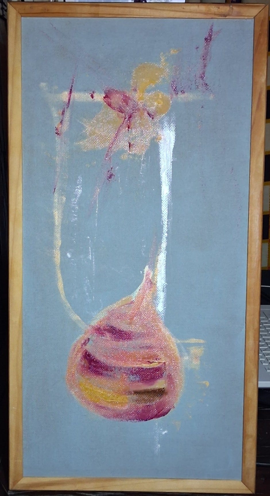 Suddenly, I realised that the most effective use of my time would be to begin painting an onion. I got what I would call, and called it a day. I took a picture of it, and sent it to my cousin, with a caption: “The start of “The Exploding Onion”. Enough for today. WIP.” She replied (and she is not always so optimistically sentimental), “I actually love it just like this. Would hang it as is. Makes me feel like being on a swing in a meadow of flowers.” I said I was thinking of putting some longitudinal lines on the onion itself, but not much more. And I had only started it to calm myself down.