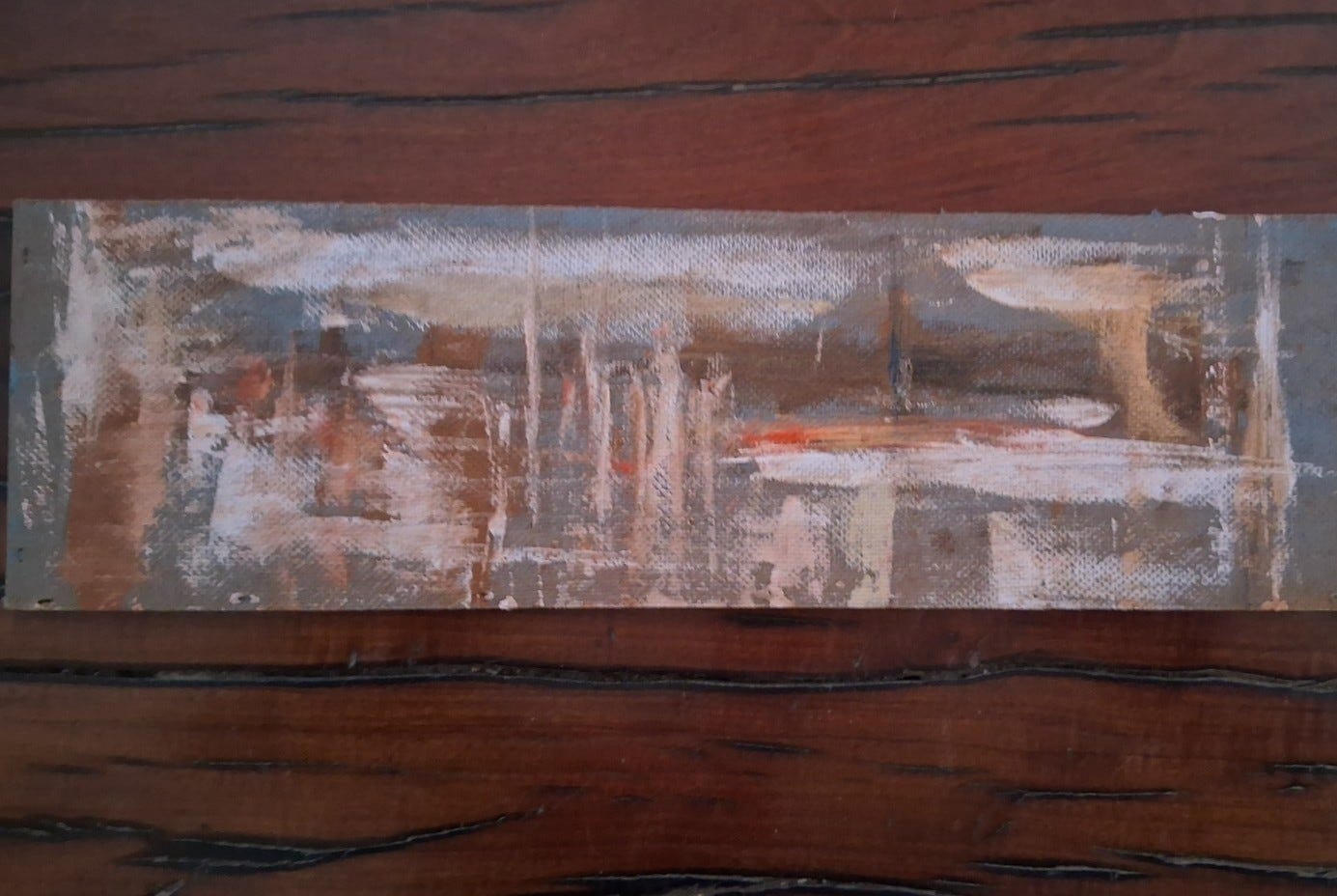The first session resulted in an offcut (14 x 46 cm)1 turning into an abstract that is suggestive of something or other — you can decide what, uninfluenced by me.