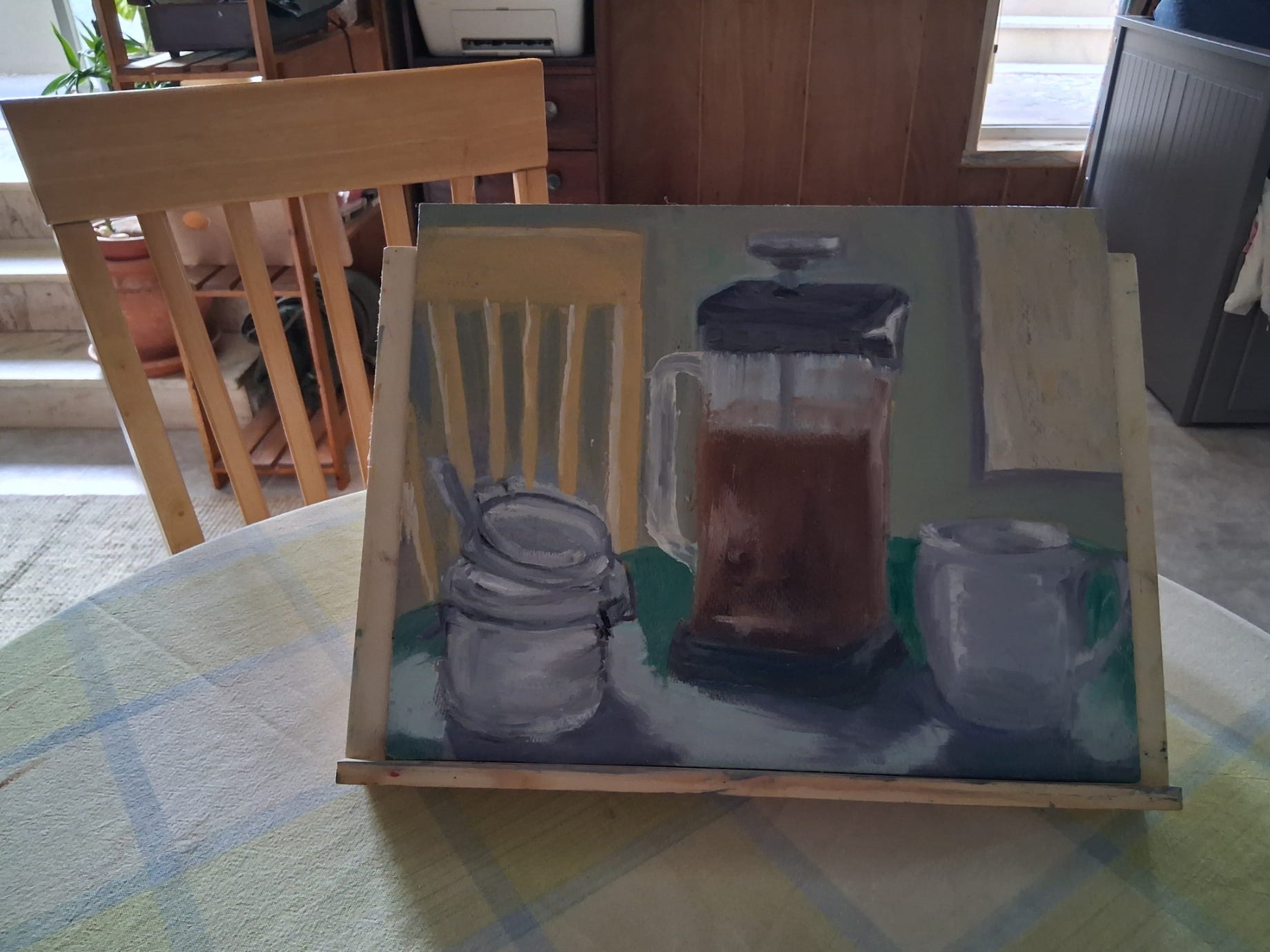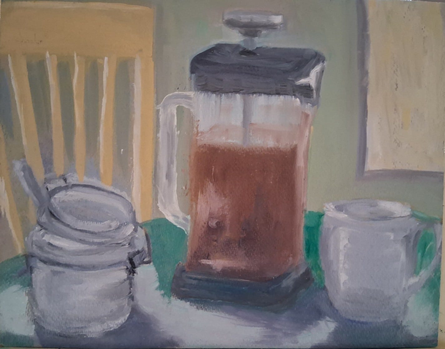 When I set up the scene for the bigger picture, I will make a pot of fresh coffee. The model for this painting involved second-hand coffee grounds, so the colour is faithful to what I saw, but you must know that I would never serve anyone coffee made that way.