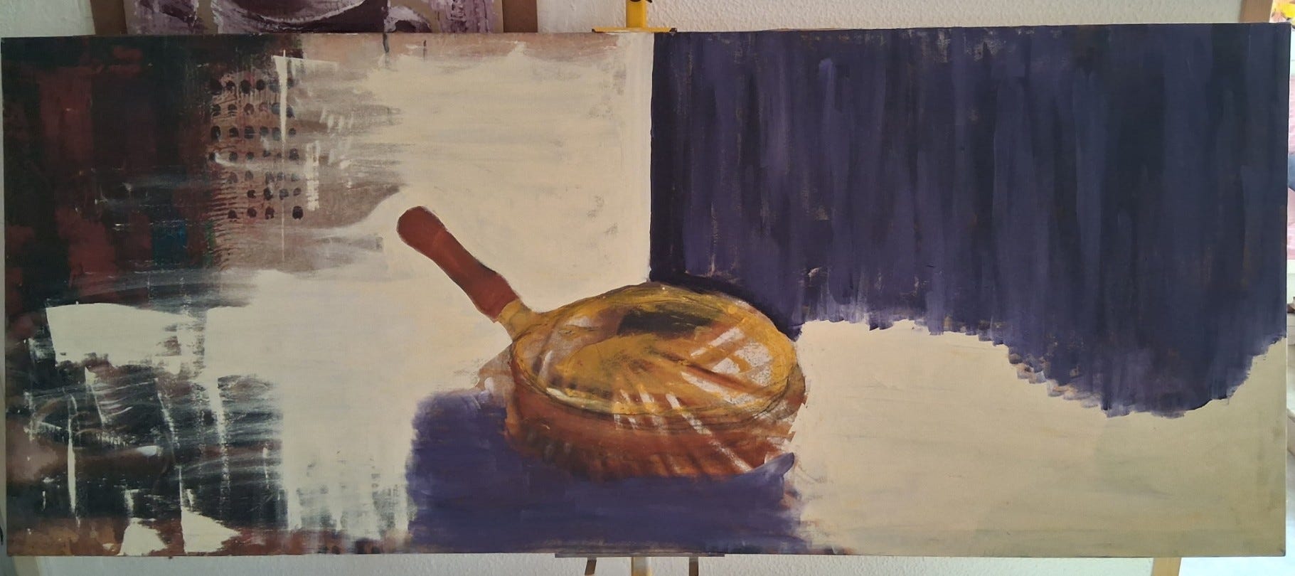 Although it is nothing much right now, I am applying my art teacher’s advice of creating “layers”, on this discarded canvas that I am repurposing. That brass pan needs serious reworking—obviously!—as soon as the cream and purple paint has dried. At least I can no longer see the original image, the supine woman who lurks beneath this new surface.